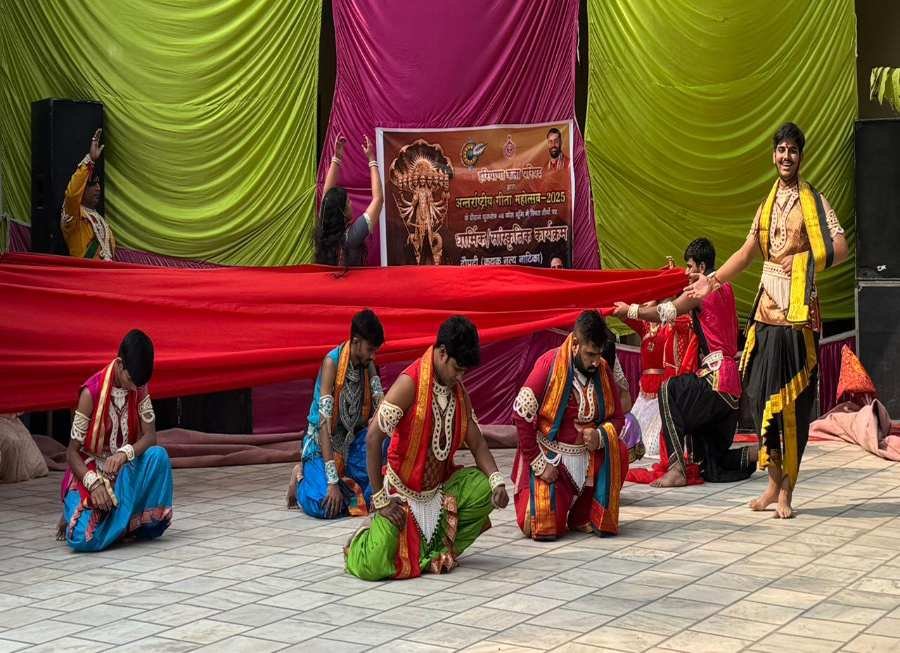 गीता महोत्सव के भव्य सांस्कृतिक मंच पर कलाकारों ने अपनी अद्भुत प्रस्तुति से ऐसा मनमोहक वातावरण रचा कि दर्शक मंत्रमुग्ध होकर देखते ही रह गए। पारंपरिक परिधानों की चमक, भावपूर्ण मुद्राएँ, लयबद्ध ताल और मंच पर बिखरी भारतीय संस्कृति की सुगंध—सबने मिलकर पूरे माहौल को दिव्यता से भर दिया। शक्ति, करुणा, भक्ति और लोक-सौंदर्य के रंग इन प्रस्तुतियों में सहज रूप से झलकते रहे। इसी बीच, श्रीकृष्ण और द्रौपदी के महाभारत प्रसंग का भावपूर्ण मंचन दर्शकों के मन में सीधा उतर गया। कलाकारों की अभिव्यक्ति, संवाद और भावनाओं की गहराई ने इस पवित्र प्रसंग को जीवंत कर दिया, जिससे पूरा पंडाल श्रद्धा और भाव-विभोर वातावरण से सराबोर हो उठा। गीता महोत्सव का यह सांस्कृतिक अध्याय वास्तव में परंपरा, कला और अध्यात्म का अद्वितीय संगम बनकर सभी के मन में अमिट छाप छोड़ गया।