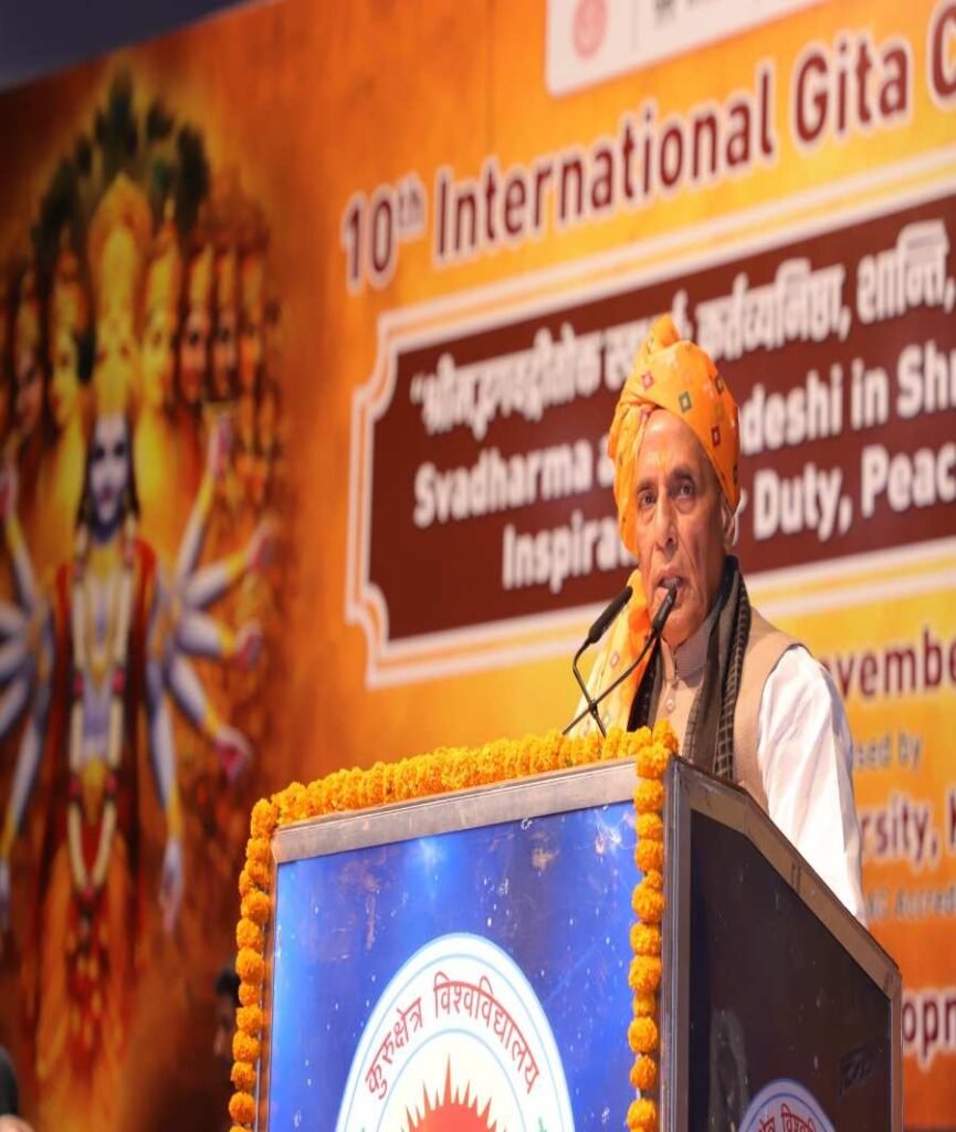 कुरुक्षेत्र विश्वविद्यालय में आयोजित अंतरराष्ट्रीय गीता सम्मेलन 2025 का भव्य उद्घाटन भारत के रक्षा मंत्री राजनाथ सिंह द्वारा किया गया। अपने संबोधन में मंत्री ने कहा कि भगवद गीता केवल भारत तक सीमित नहीं, बल्कि पूरी मानवता के लिए शाश्वत संदेश लेकर आई है। गीता न केवल एक ग्रंथ बल्कि जीवन में कर्तव्य, साहस, आत्मबल और निस्वार्थ कर्म का सर्वोत्तम मार्गदर्शन प्रस्तुत करती है। उन्होंने ऑपरेशन ‘सिंदूर’ का उल्लेख करते हुए बताया कि युद्ध बदले के लिए नहीं, बल्कि धर्म की स्थापना के लिए होता है।