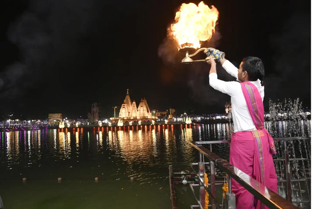 अंतर्राष्ट्रीय गीता महोत्सव के सांध्यकालीन महाआरती में ब्रह्मसरोवर, पुरुषोत्तमपुरा बाग रंगों और श्रद्धा की छटा से जगमगा उठा। हरियाणा के जनस्वास्थ्य एवं लोक निर्माण मंत्री रणबीर सिंह गंगवा ने कहा कि श्रीमद्भगवद्गीता जीवन की हर समस्या का मार्गदर्शन करती है और प्रत्येक श्लोक में हमारे सवालों का उत्तर निहित है। महाआरती में मंत्रमुग्ध कर देने वाले मंगलगान और दीपों की रोशनी ने वातावरण को आध्यात्मिक ऊर्जा से भर दिया। मंत्री गंगवा ने युवाओं के उत्साह की प्रशंसा करते हुए कहा कि गीता के मूल्यों से उनकी आस्था आज भी गहरी जुड़ी हुई है। इस अवसर पर कई गणमान्य अधिकारी, संत और समाजसेवी उपस्थित रहे, जिन्होंने मिलकर महोत्सव को एक भव्य और यादगार सांस्कृतिक उत्सव बनाया।