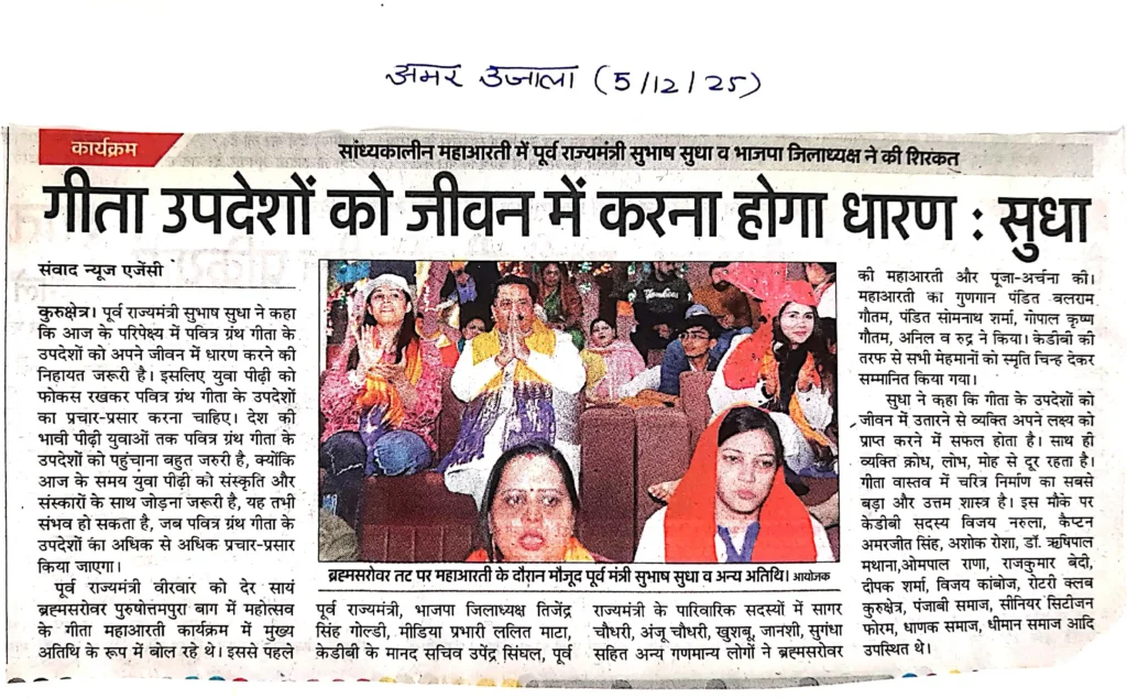 गीता महाआरती में सुभाष सुधा का संदेश: संस्कृति और संस्कार से जुड़ें युवाBy administrator / December 5, 2025