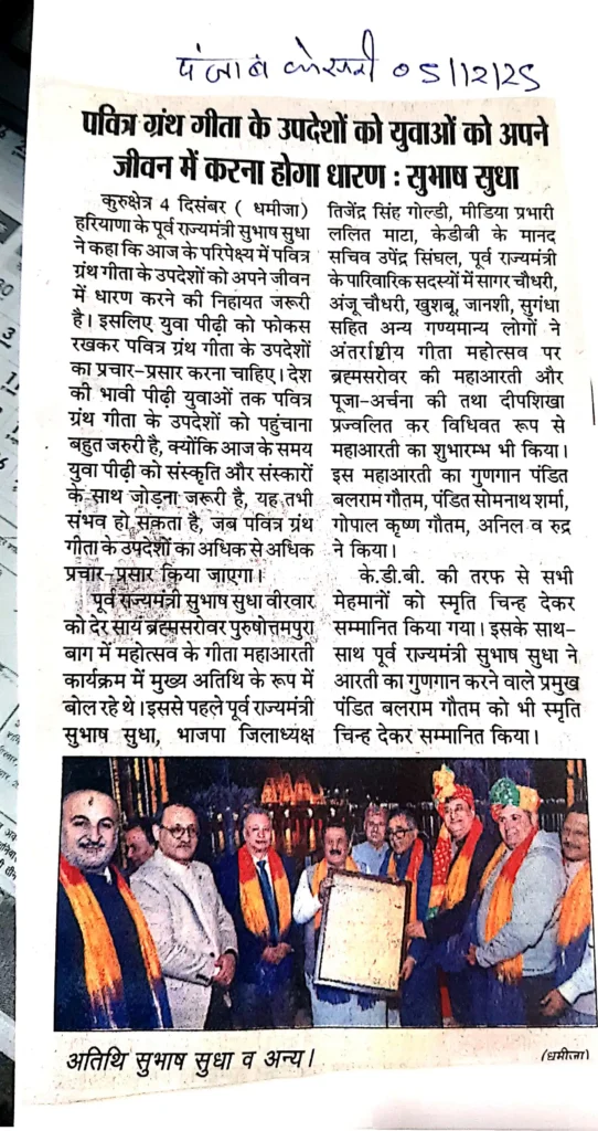 पवित्र ग्रंथ गीता के उपदेशों को युवाओं को अपने जीवन में करना होगा धारण : सुभाष सुधाBy administrator / December 5, 2025
