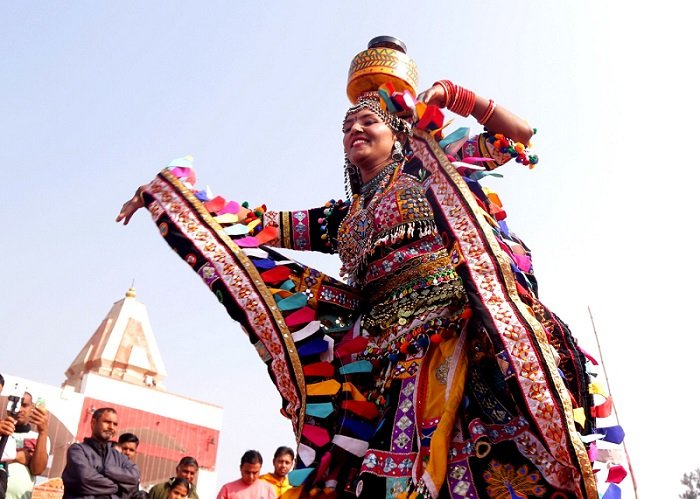 The performer in the image, dressed in an exquisitely embroidered multicolour skirt, stunning jewellery and beautifully balanced decorative pots on her head, represents the true essence of Rajasthani folk tradition.