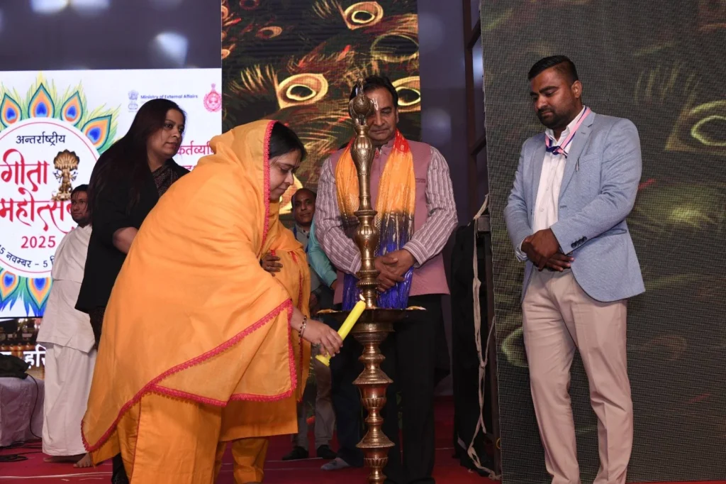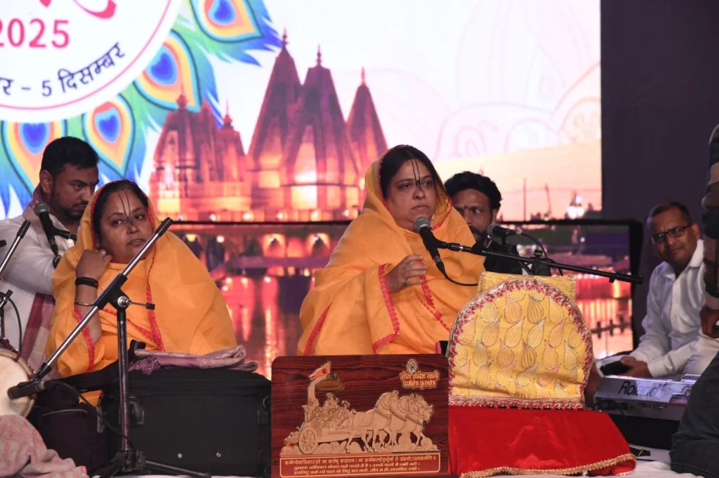 अंतर्राष्ट्रीय गीता महोत्सव 2025 की सांस्कृतिक संध्या में साध्वी पूर्णिमा जी द्वारा प्रस्तुत भक्ति-पूर्ण कार्यक्रम ने पुरूषोत्तमपुरा बाग के पूरे वातावरण को दिव्यता और आध्यात्मिक ऊर्जा से आलोकित कर दिया। उनके मधुर भजनों, सुरों में निहित श्रद्धा और भावनाओं से भरी प्रस्तुति ने उपस्थित जन-समूह के हर हृदय को भक्ति, शांति और आध्यात्मिक आनंद से भर दिया। यह संध्या न केवल भक्ति और संगीत का अद्भुत संगम थी, बल्कि महोत्सव की सांस्कृतिक महिमा को भी नई ऊँचाईयों पर ले गई। उनके सुर, ताल और माधुर्य ने पूरे परिसर को मंत्रमुग्ध कर देने वाला अनुभव प्रदान किया, मानो पूरा क्षेत्र भक्ति-रस और आध्यात्मिक आनंद से सराबोर हो उठा हो। इस दिव्य अनुभव ने अंतर्राष्ट्रीय गीता महोत्सव को यादगार और अनुपम बना दिया, जहाँ श्रद्धालु, दर्शक और कलाकार एक साथ आध्यात्मिक और सांस्कृतिक समरसता का अनुभव कर सके।