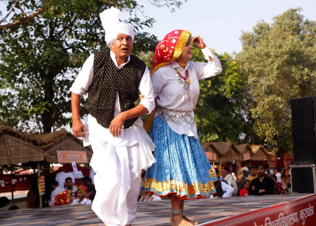 कुरुक्षेत्र, 4 दिसंबर। अंतर्राष्ट्रीय गीता महोत्सव में स्थापित हरियाणवी पैवेलियन आज हरियाणवी संस्कृति की धूम से गूंज उठा। पुरुषोत्तमपुरा बाग, ब्रह्मसरोवर स्थित सांस्कृतिक मंच पर कुरुक्षेत्र विकास बोर्ड, युवा एवं सांस्कृतिक कार्य विभाग और कुरुक्षेत्र विश्वविद्यालय के संयुक्त प्रयास से आयोजित कार्यक्रमों में हरियाणा कला परिषद के कलाकारों ने लोकगीत, रागनियाँ, भजन और नृत्य के माध्यम से दर्शकों का मन मोह लिया। लोक कलाकारों की प्रस्तुतियों में पारंपरिक गीतों और भजनों की मधुरता ने श्रोताओं को मंत्रमुग्ध कर दिया, जबकि कई पर्यटक कलाकारों के साथ ताल से ताल मिलाते और थिरकते भी नजर आए। सामाजिक कुरीतियों पर आधारित रागनियों ने जागरूकता का संदेश दिया, और धार्मिक भजनों ने माहौल को भक्तिरस से सराबोर कर दिया। हरियाणा पैवेलियन में उपस्थित दर्शक लोक संस्कृति, लोक रंग और परंपरा का आनंद लेते हुए महोत्सव की रौनक में चार चाँद लगा रहे थे।