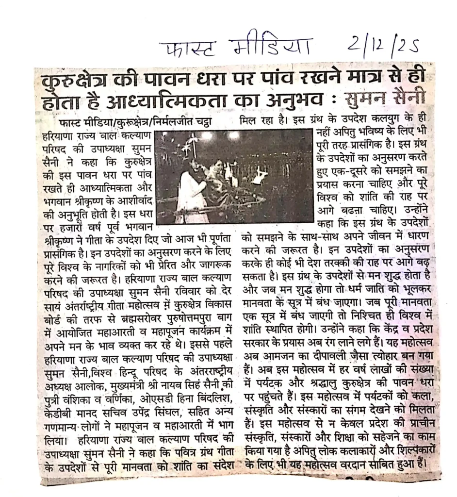 Print Media IGM 2025कुरुक्षेत्र की पावन धरा पर पांव रखने मात्र से ही होता है आध्यात्मिकता का अनुभव : सुमन सैनी administrator / December 6, 2025