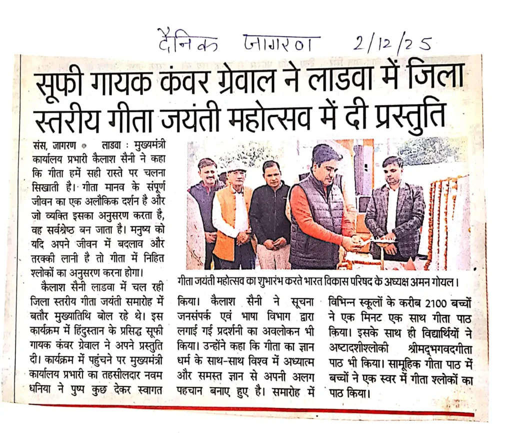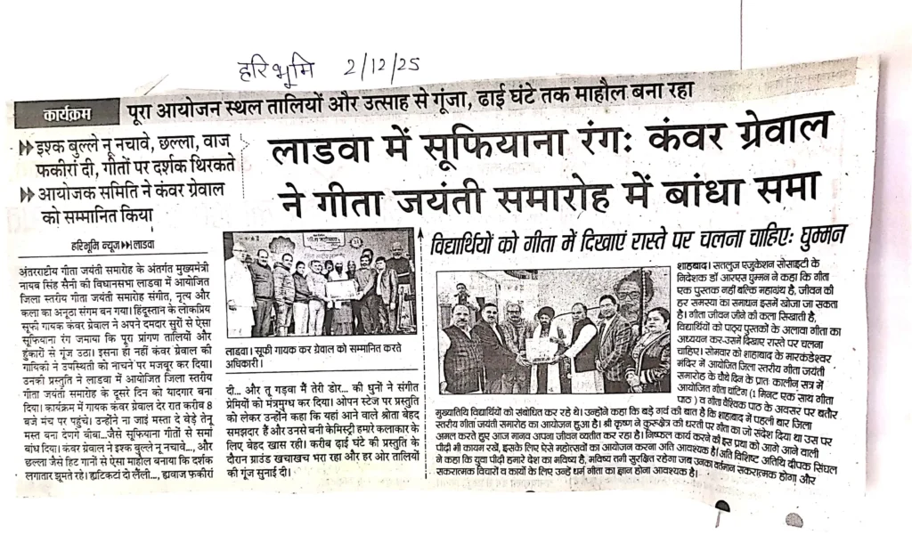 Print Media IGM 2025सूफी गायक कंवर ग्रेवाल ने लाडवा में जिला स्तरीय गीता जयंती महोत्सव में दी प्रस्तुति administrator / December 6, 2025