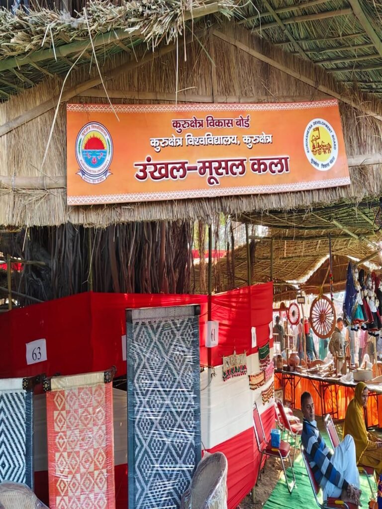 गीता महोत्सव में हरियाणा का लोक-हुनर जीवंत हो उठता है—उंखल-मूसल कला से अनाज कूटने की प्राचीन देसी तकनीक, पीढ़ा बुनाई