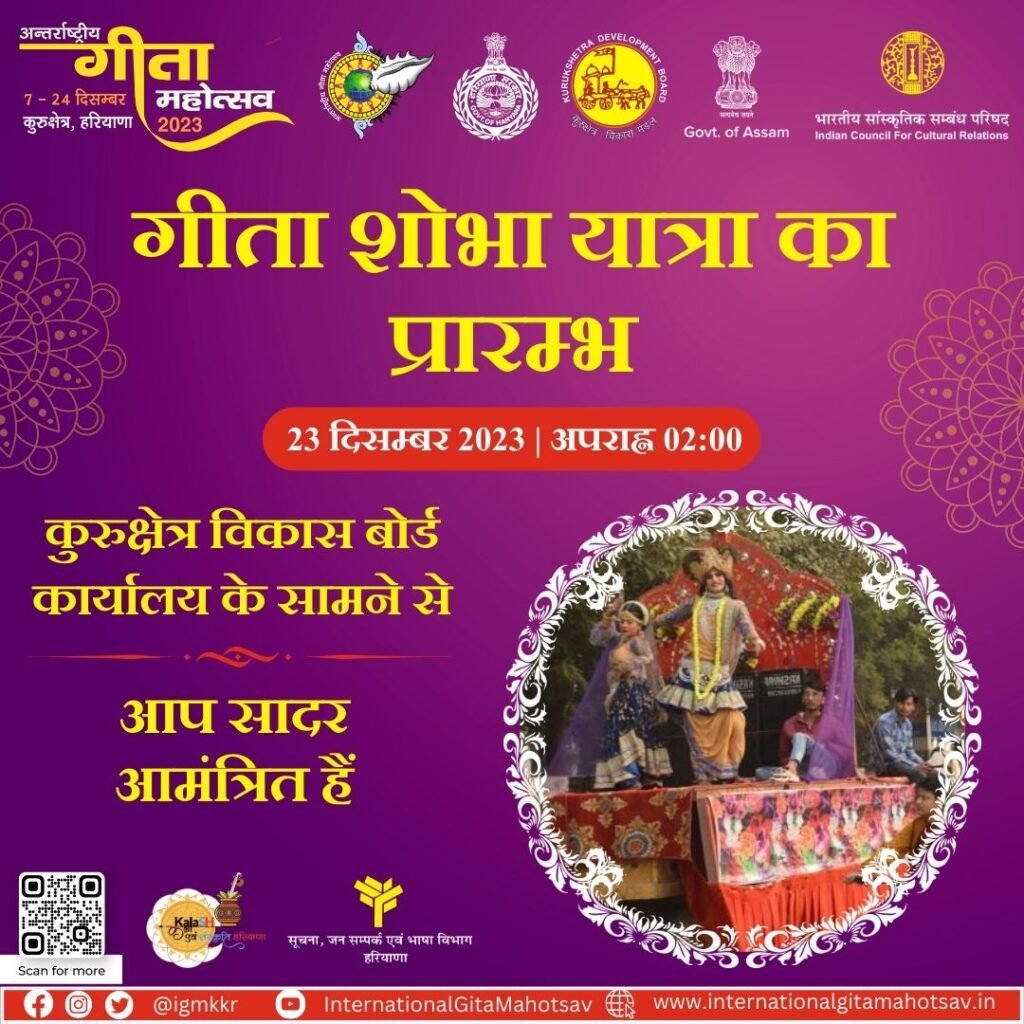 अंतरराष्ट्रीय गीता महोत्सव 2023 के तहत, 23 दिसम्बर 2023 को, कुरुक्षेत्र विकास बोर्ड कार्यालय के सामने से एक शानदार गीता