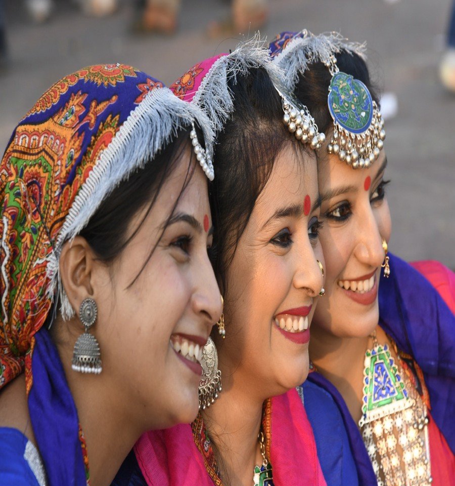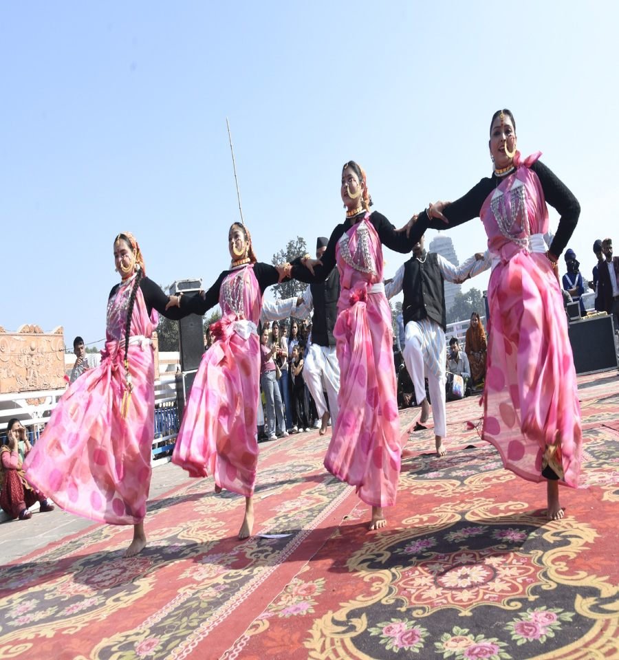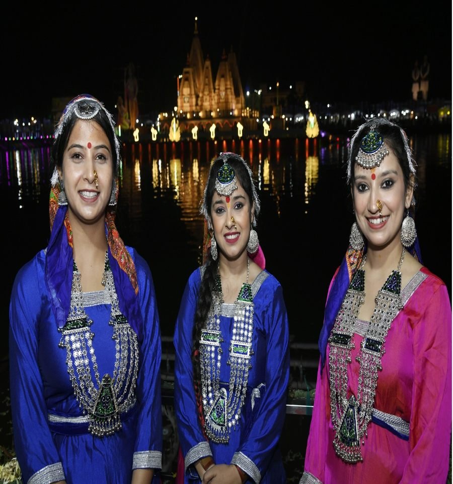 अंतर्राष्ट्रीय गीता महोत्सव की दिव्य रात्रि में, पारंपरिक वेशभूषा में सजी कलाकाराओं ने अपनी उज्ज्वल मुस्कानों और लोक-संस्कृति की चमक