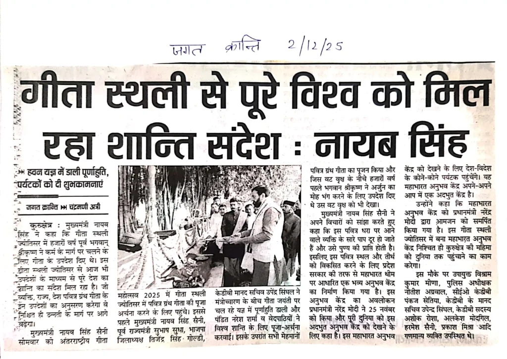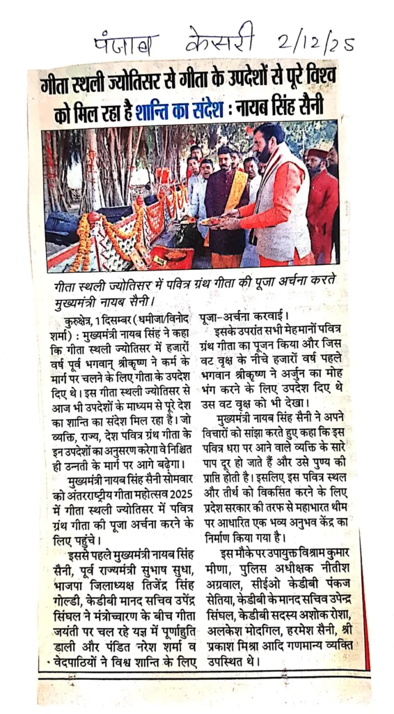 Print Media IGM 2025गीता स्थली ज्योतिसर से गीता के उपदेशों से पूरे विश्व को मिल रहा है शान्ति का संदेश : नायब सिंह सैनी administrator / December 6, 2025