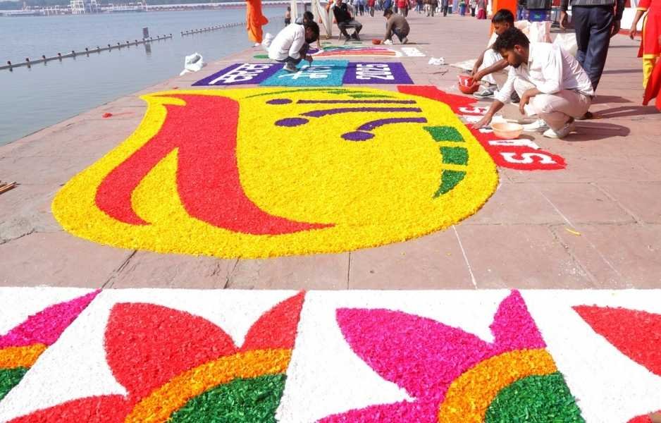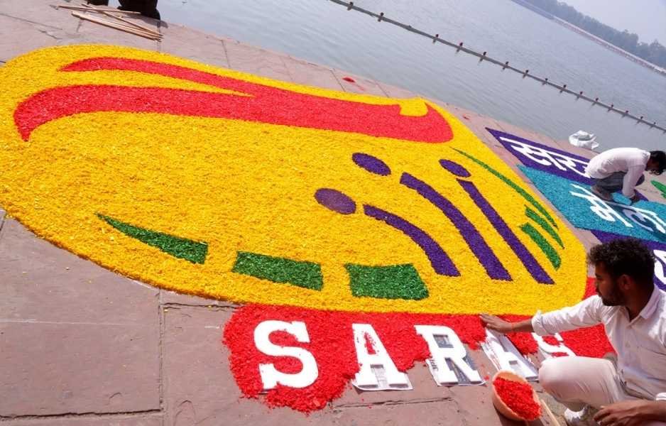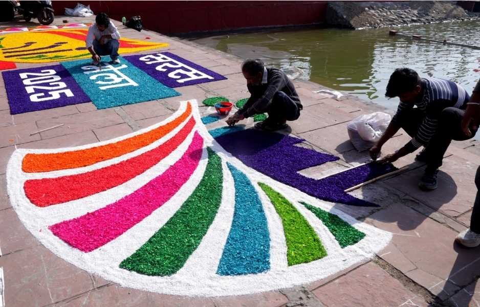 At the heart of the International Gita Mahotsav, this stunning rangoli made of vibrant flower petals celebrates the spirit of unity, tradition, and divine wisdom. With “SARAS” beautifully etched in white petals and intricate Hindi designs alongside, it’s more than art—it’s a tribute to the timeless teachings of the Bhagavad Gita.