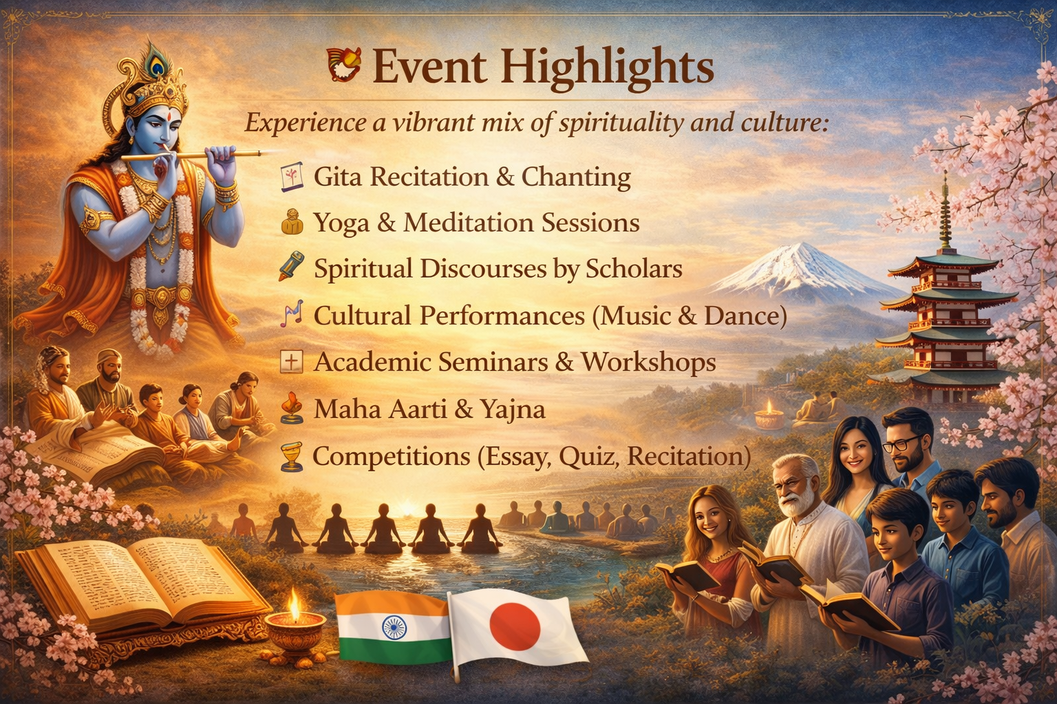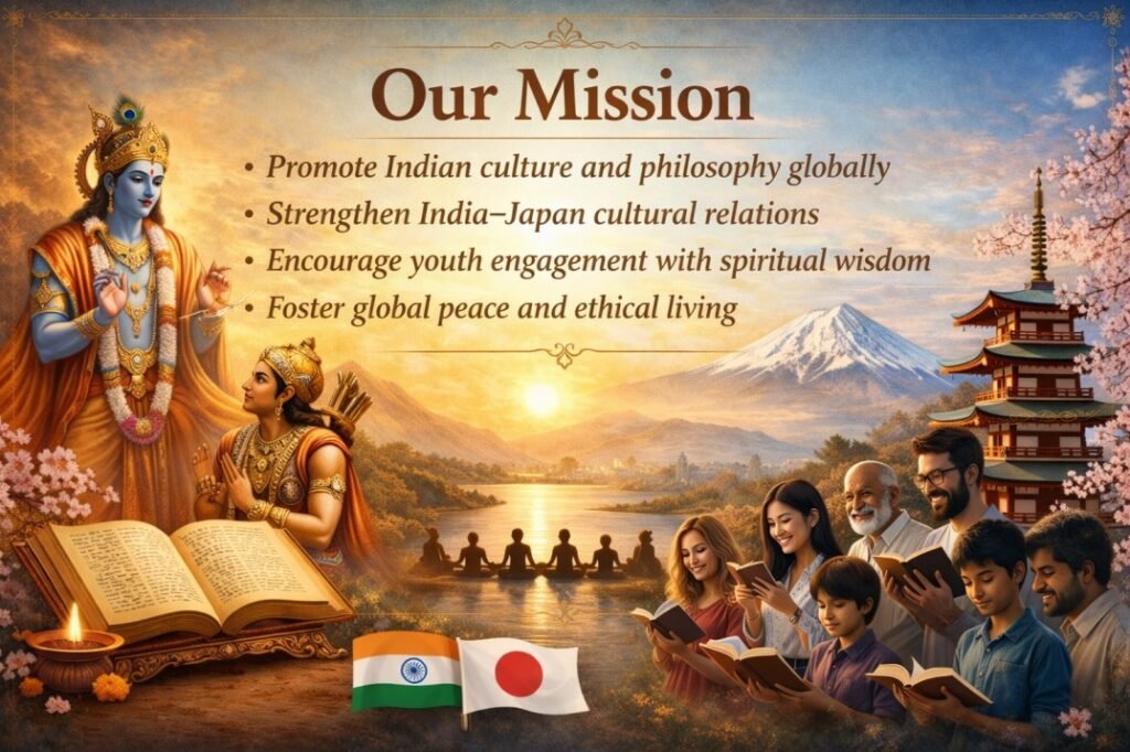 About the Festival The International Gita Mahotsav is a unique spiritual and cultural event inspired by the teachings of the Bhagavad Gita. Originating from Kurukshetra, the land where the Gita was delivered, the festival has grown into a global movement.The Japan edition aims to promote:Universal values of dharma (duty)Selfless action (karma yoga)Peace and harmony among nations